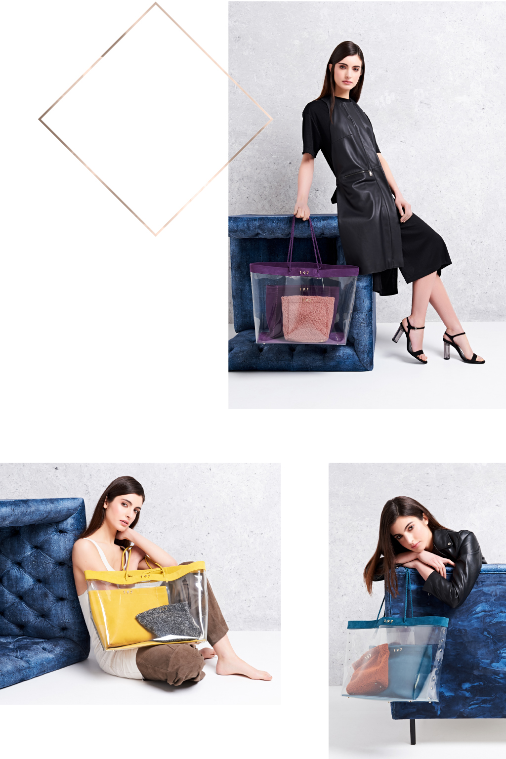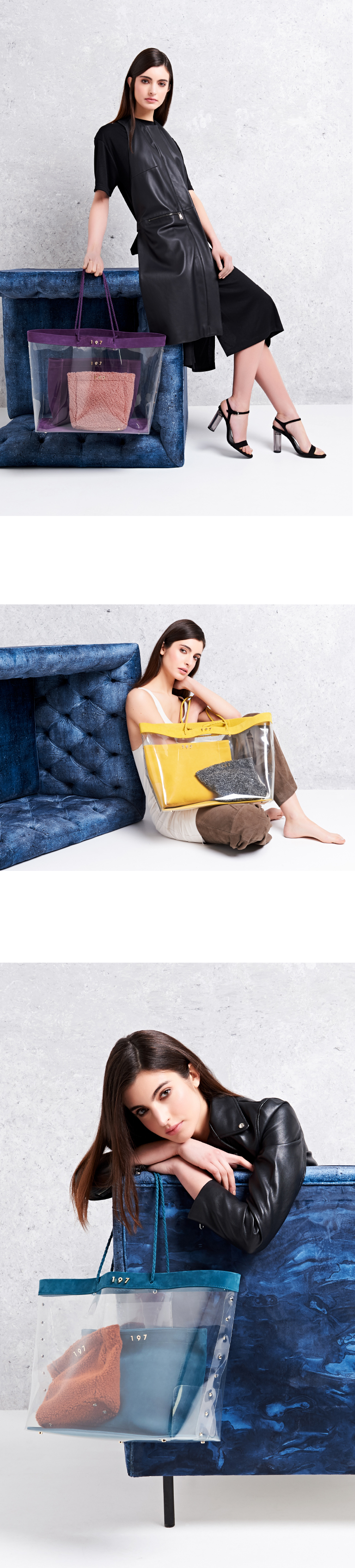 The three bags in this collection are a fusion of transparency and colour, they are interchangeable and can be used on their own or together. Different materials have been used for each bag: clear PVC for 1, nappa leather for 9 and plush for 7.