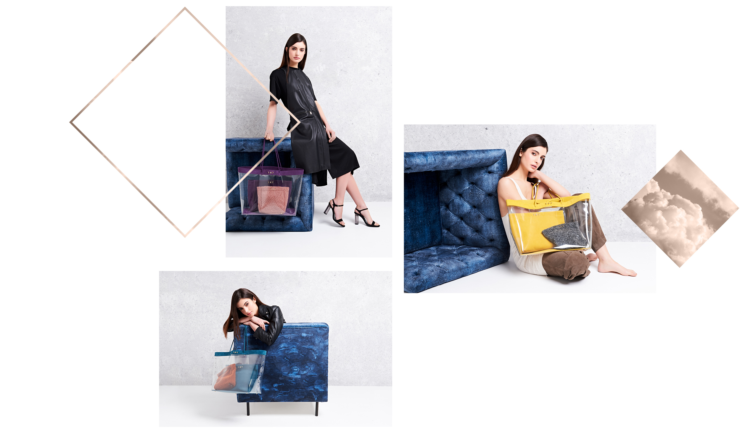 The three bags in this collection are a fusion of transparency and colour, they are interchangeable and can be used on their own or together. Different materials have been used for each bag: clear PVC for 1, nappa leather for 9 and plush for 7.